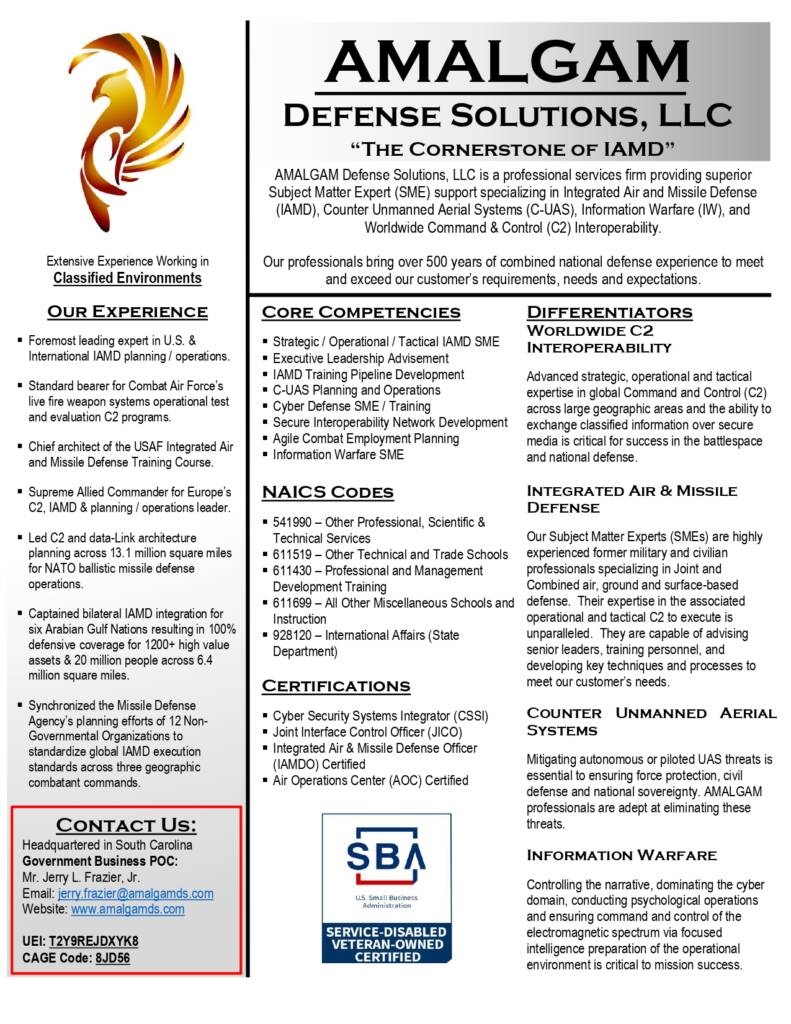 AMALGAM Defense Solutions, LLC is the Cornerstone of Integrated Air and Missile Defense (IAMD), Counter Unmanned Aerial Systems (C-UAS), World-Wide Command and Control (C2) Interoperability and Cyber Defense professional services.